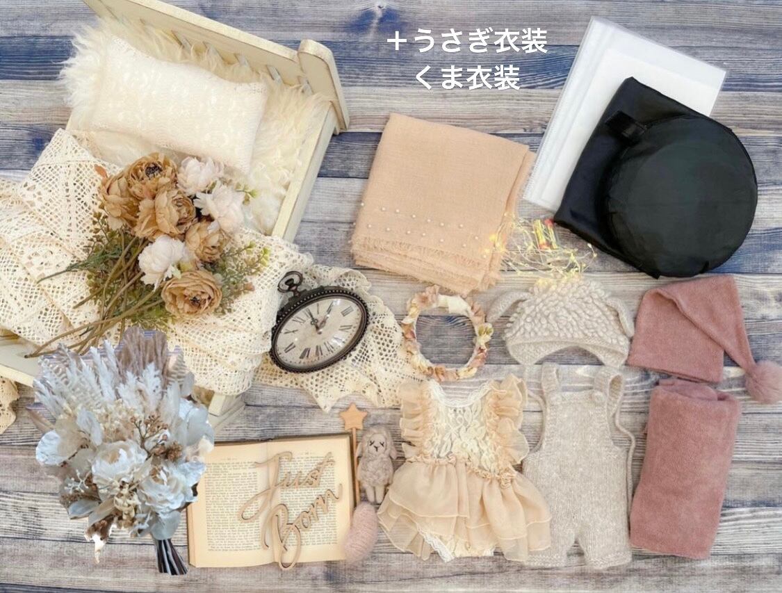お衣装4着(①うさぎさん、②くまさん、③ドレスと花冠または探偵とメガネ、④おやすみ衣装くすみピンクまたはベージュ)