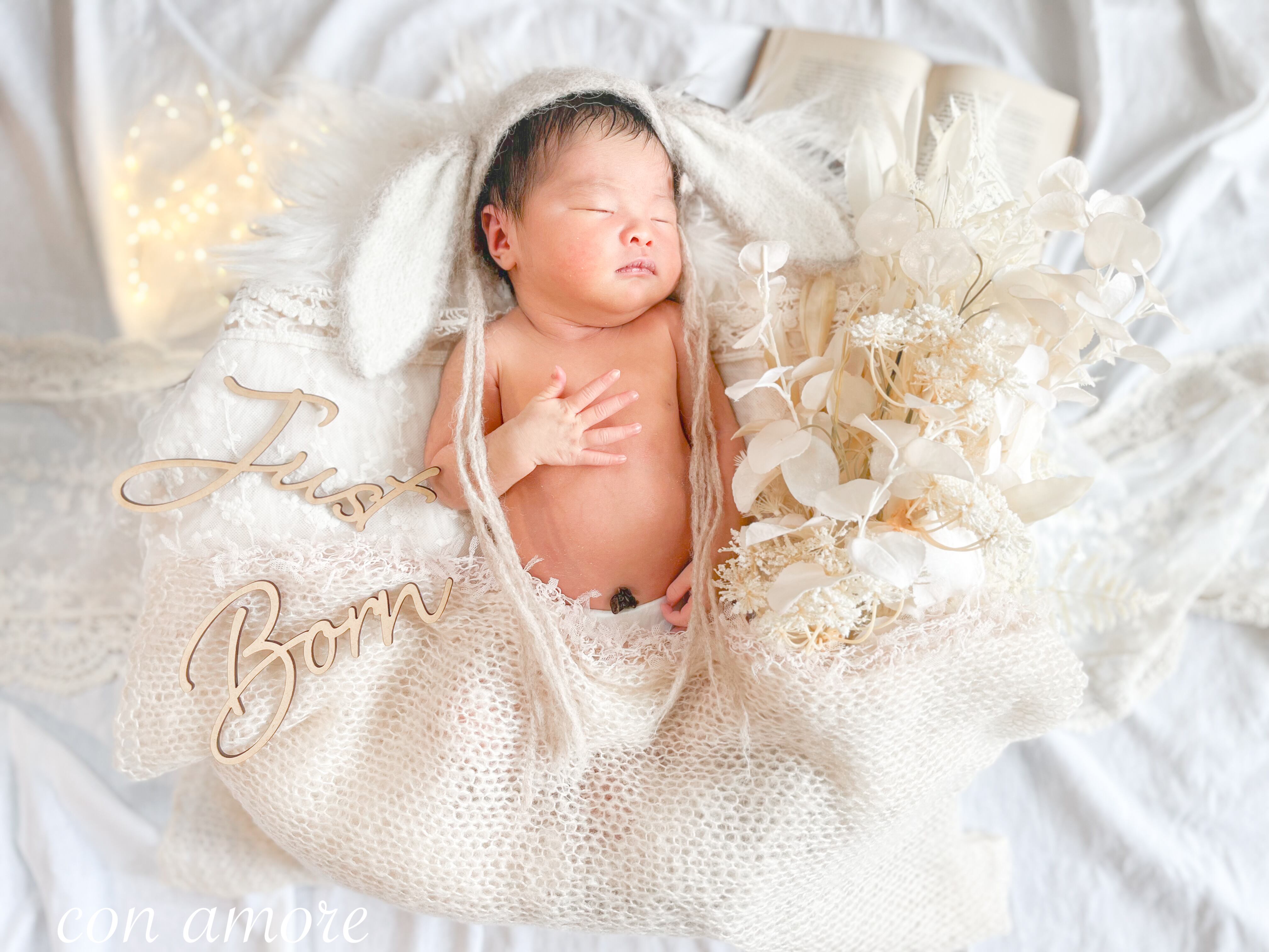 ファーマット・造花・洋書(年季が入っているものになります)・レターバナー・イルミネーション・あみぐるみ・星のステッキ・レース・レフ板・お衣装4点(①うさぎさん、②くまさん、③ドレスと花冠または探偵とメガネ、④おくるみボンネット)・マニュアル(撮り方コツや返送の仕方を記載)