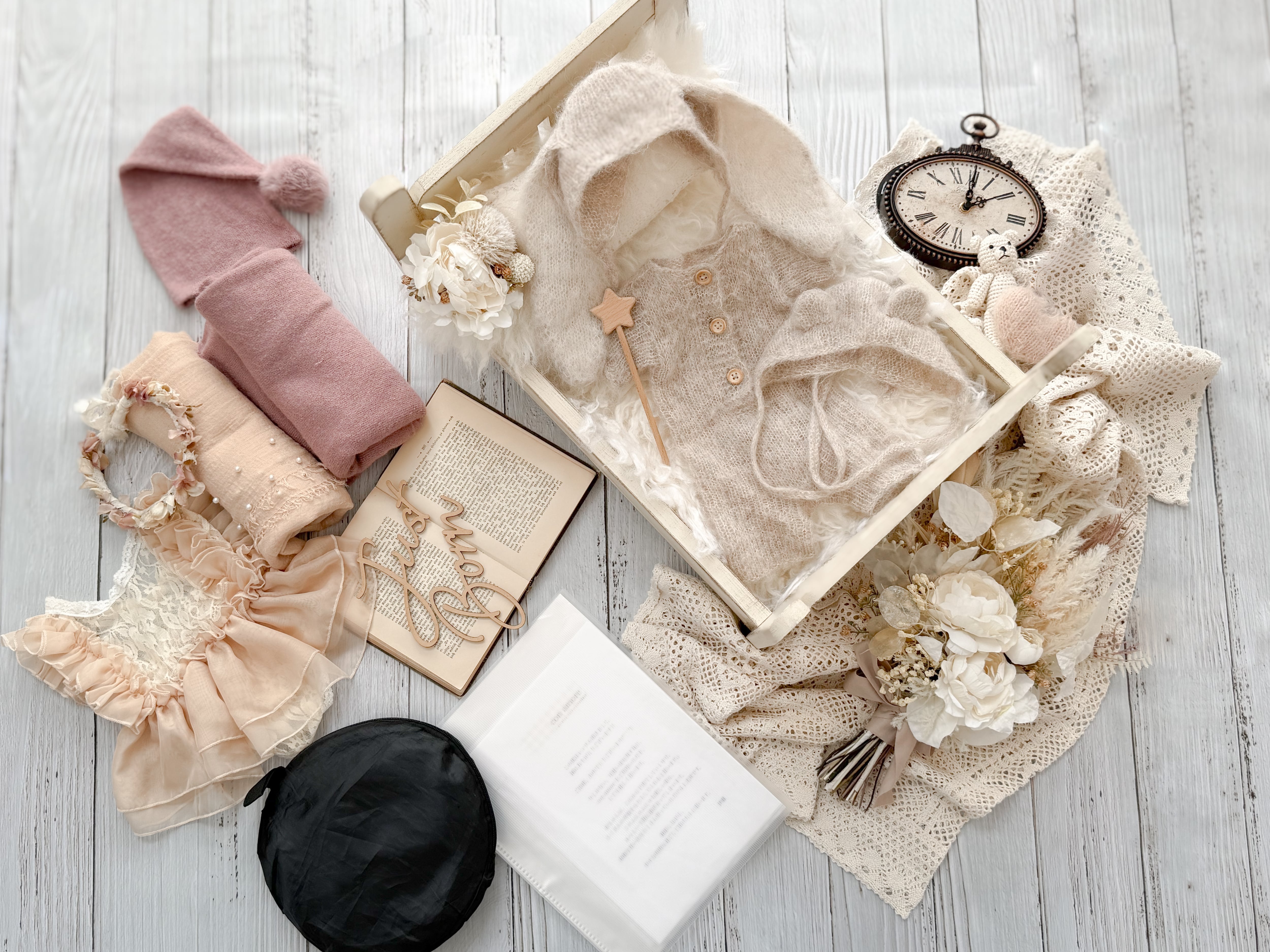 お衣装4着(①うさぎさん、②くまさん、③ドレスと花冠または探偵とメガネ、④おやすみ衣装くすみピンクまたはベージュ)