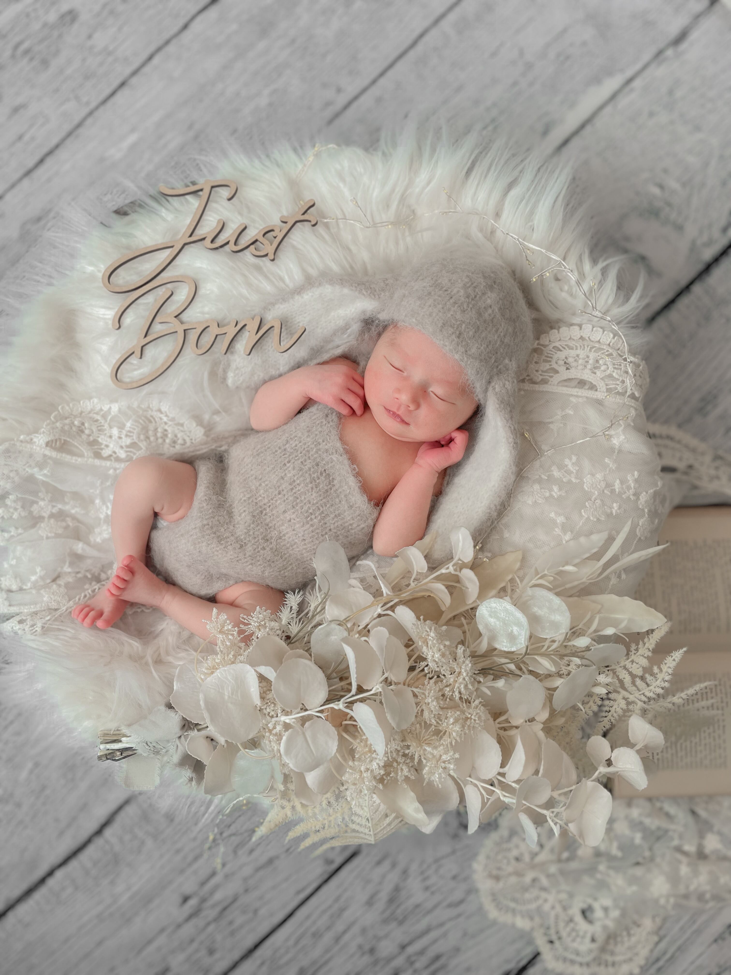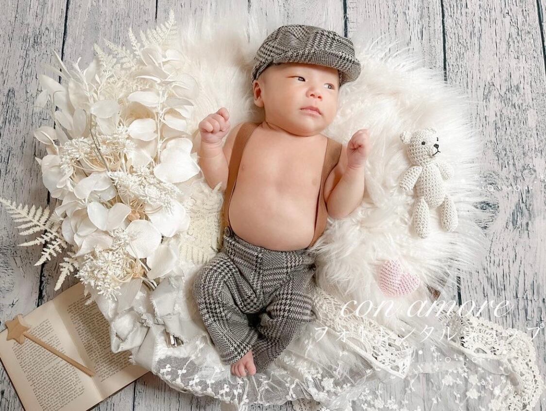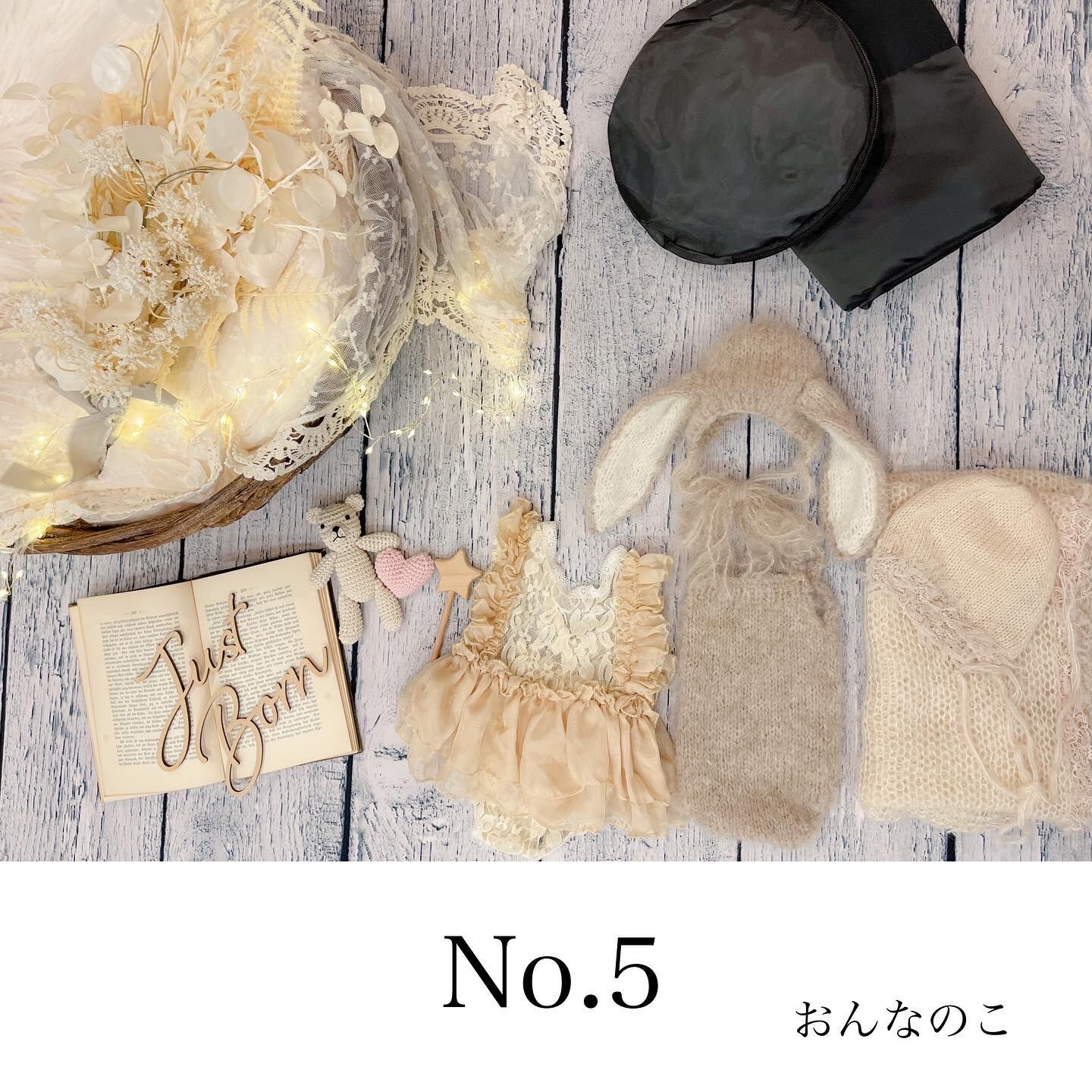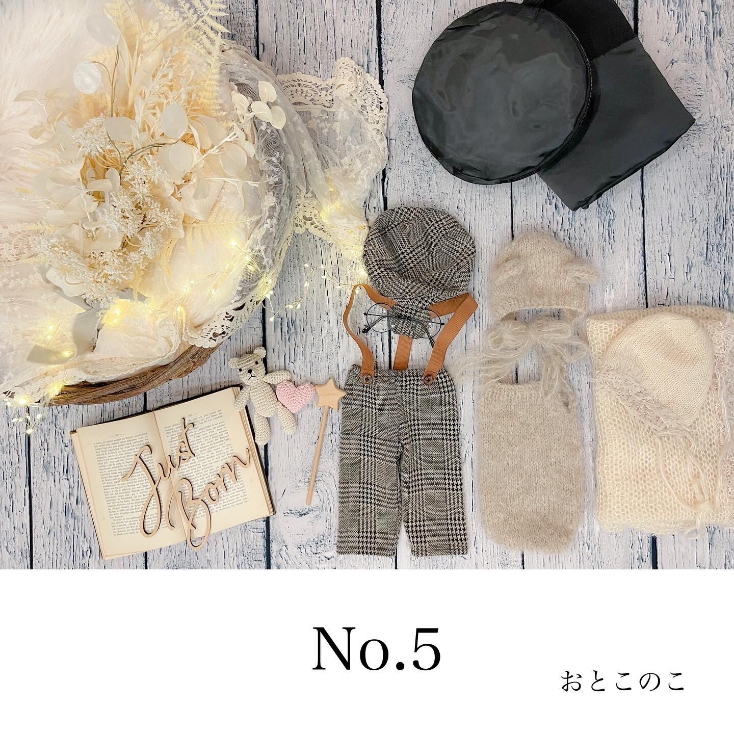 ファーマット・造花・洋書(年季が入っているものになります)・レターバナー・イルミネーション・あみぐるみ・星のステッキ・レース・レフ板・お衣装4点(①うさぎさん、②くまさん、③ドレスと花冠または探偵とメガネ、④おくるみボンネット)・マニュアル(撮り方コツや返送の仕方を記載)