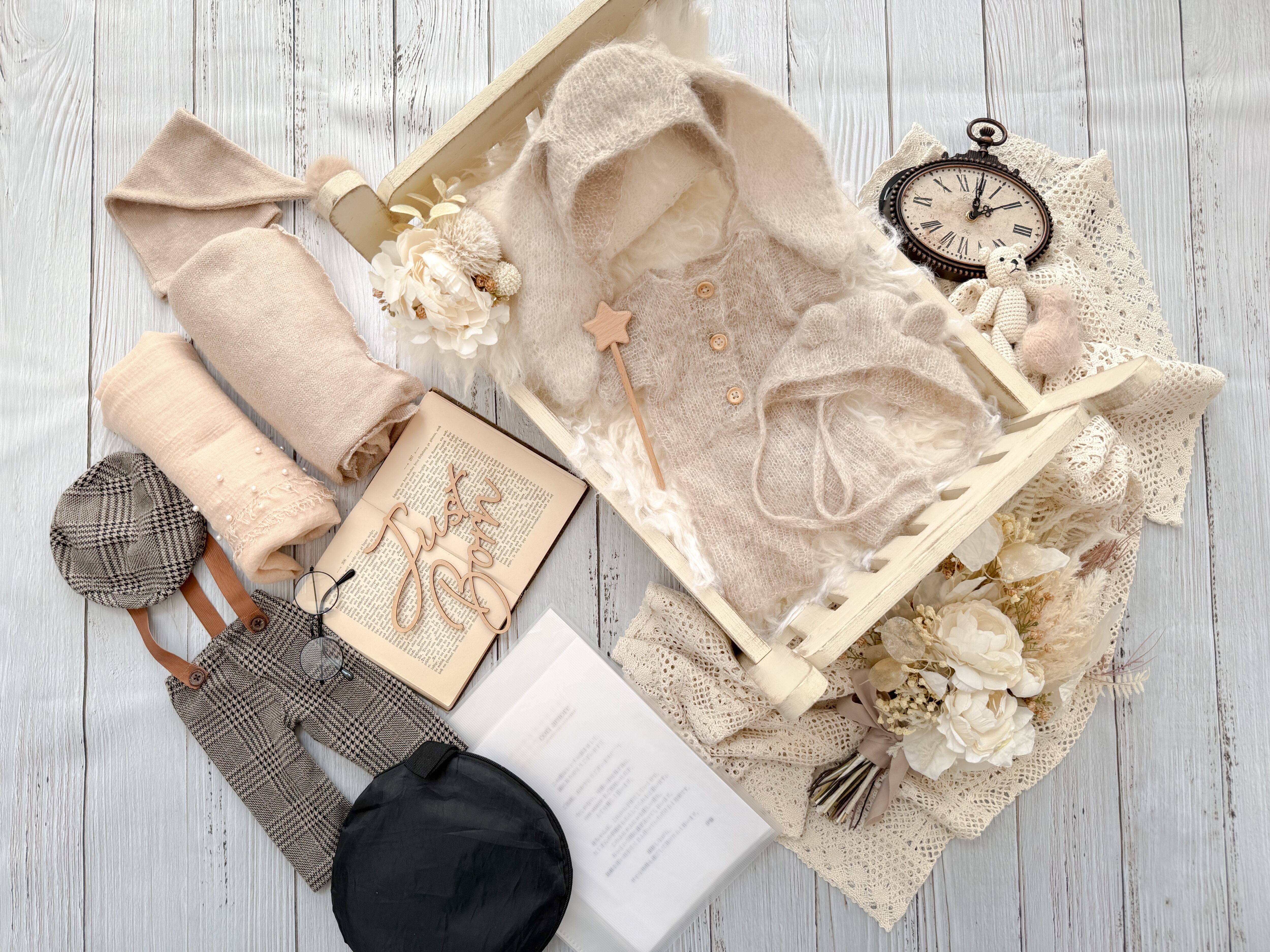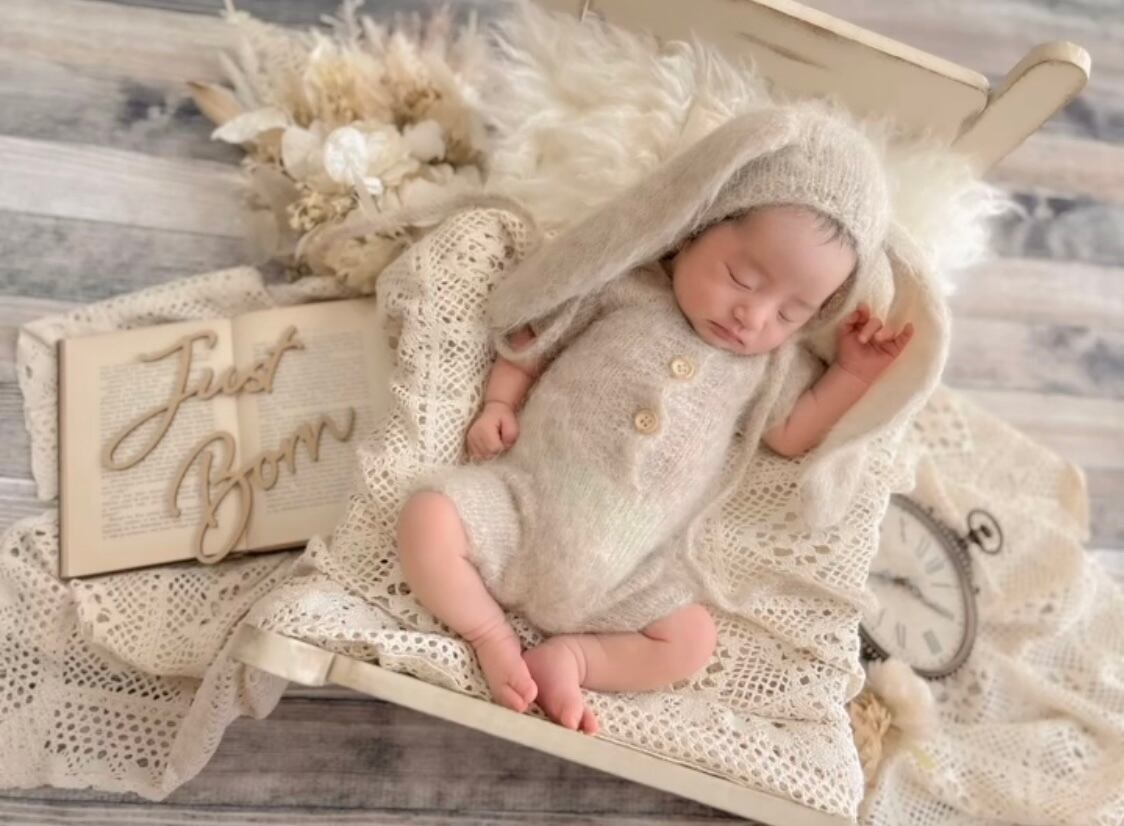 お衣装4着(①うさぎさん、②くまさん、③ドレスと花冠または探偵とメガネ、④おやすみ衣装くすみピンクまたはベージュ)