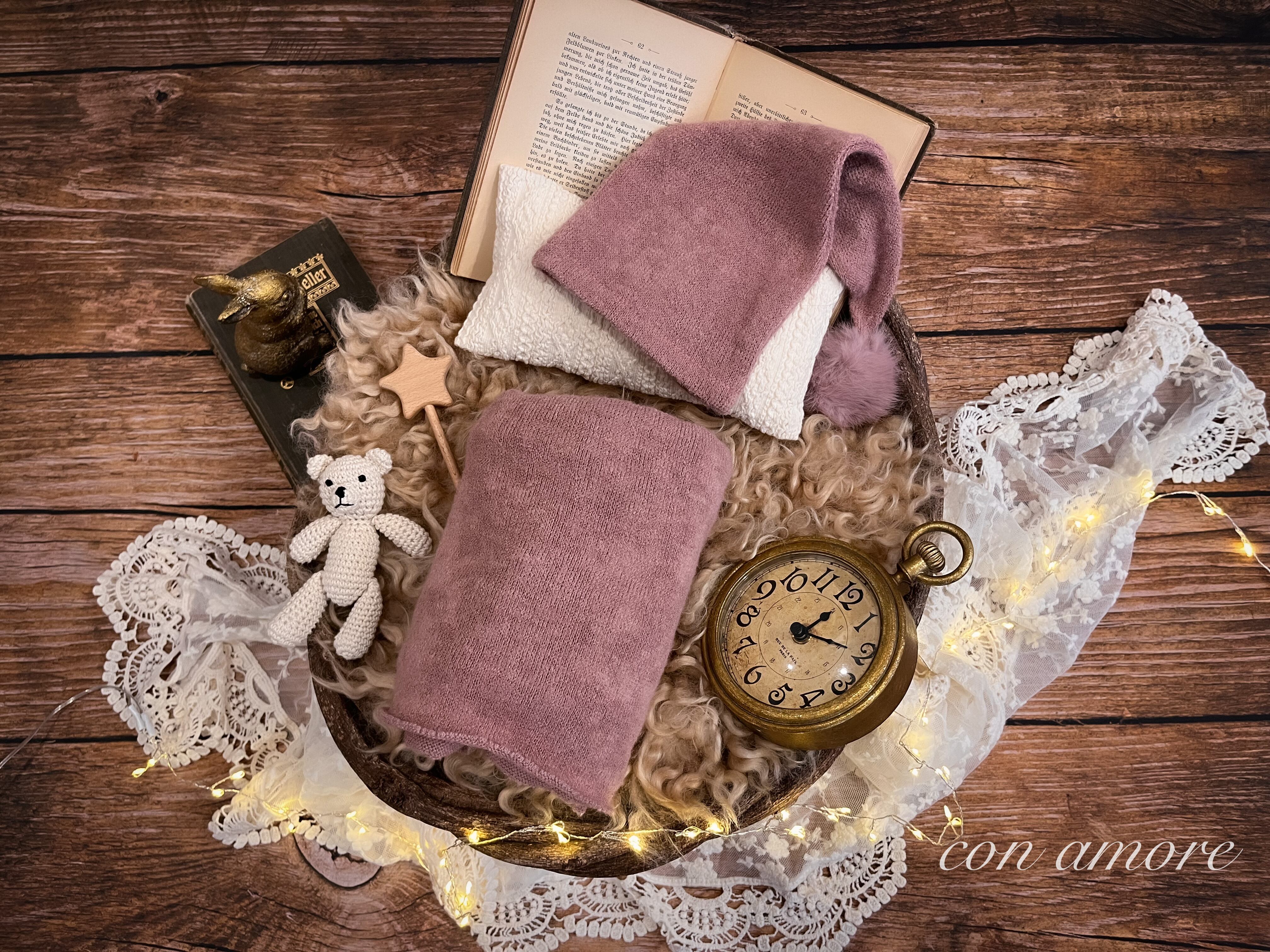 ファーマット・造花・洋書2冊(年季が入っているものになります)・レターバナー・置き時計・うさぎの置物・イルミネーション・あみぐるみ・星のステッキ・レース・枕・レフ板・