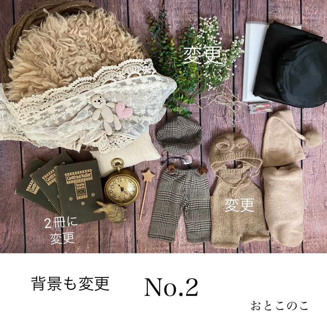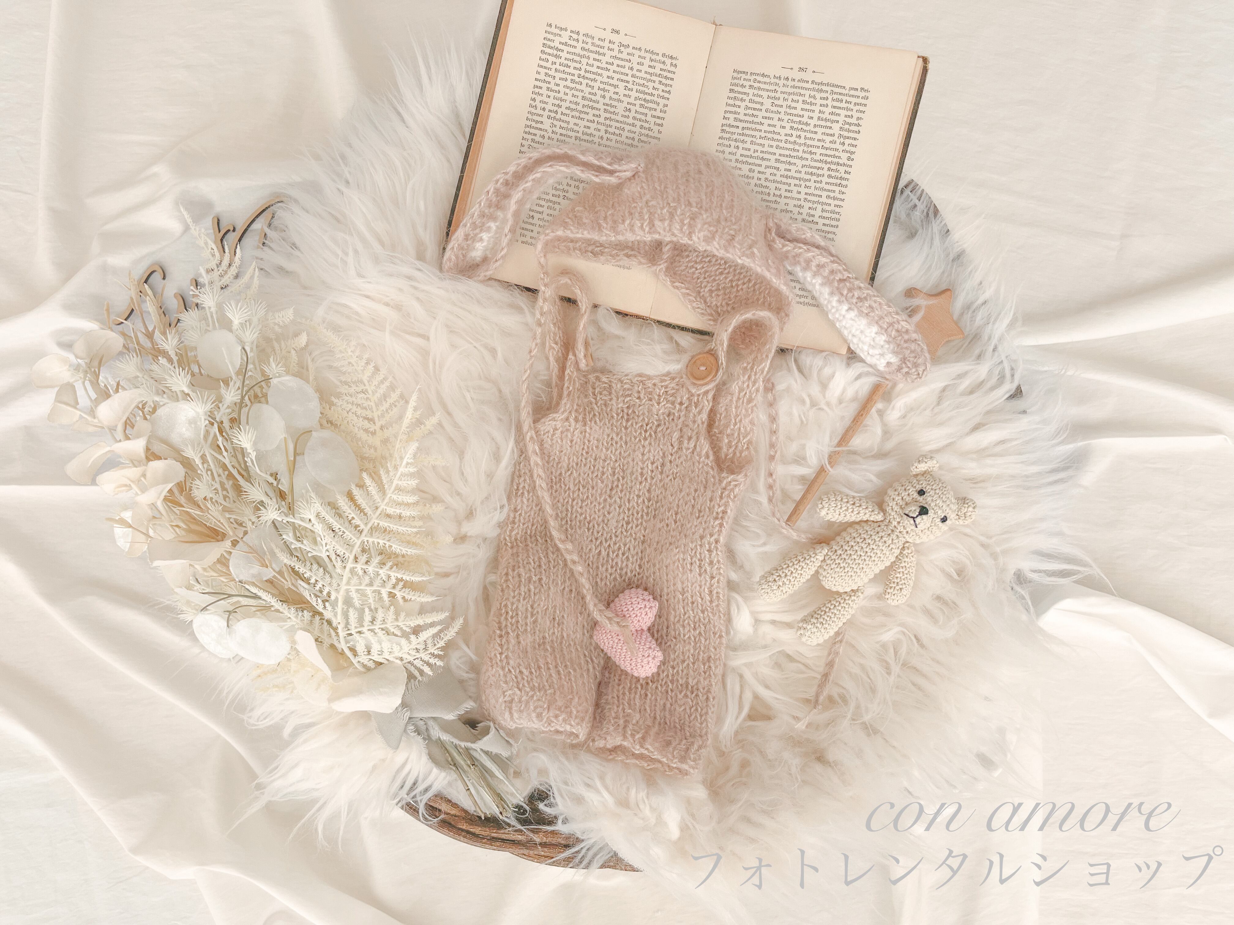 お衣装4点(①うさぎさん、②くまさん、③ドレスと花冠または探偵とメガネ、④小人服くすみピンクかベージュ)・マニュアル(撮り方コツや返送の仕方を記載)