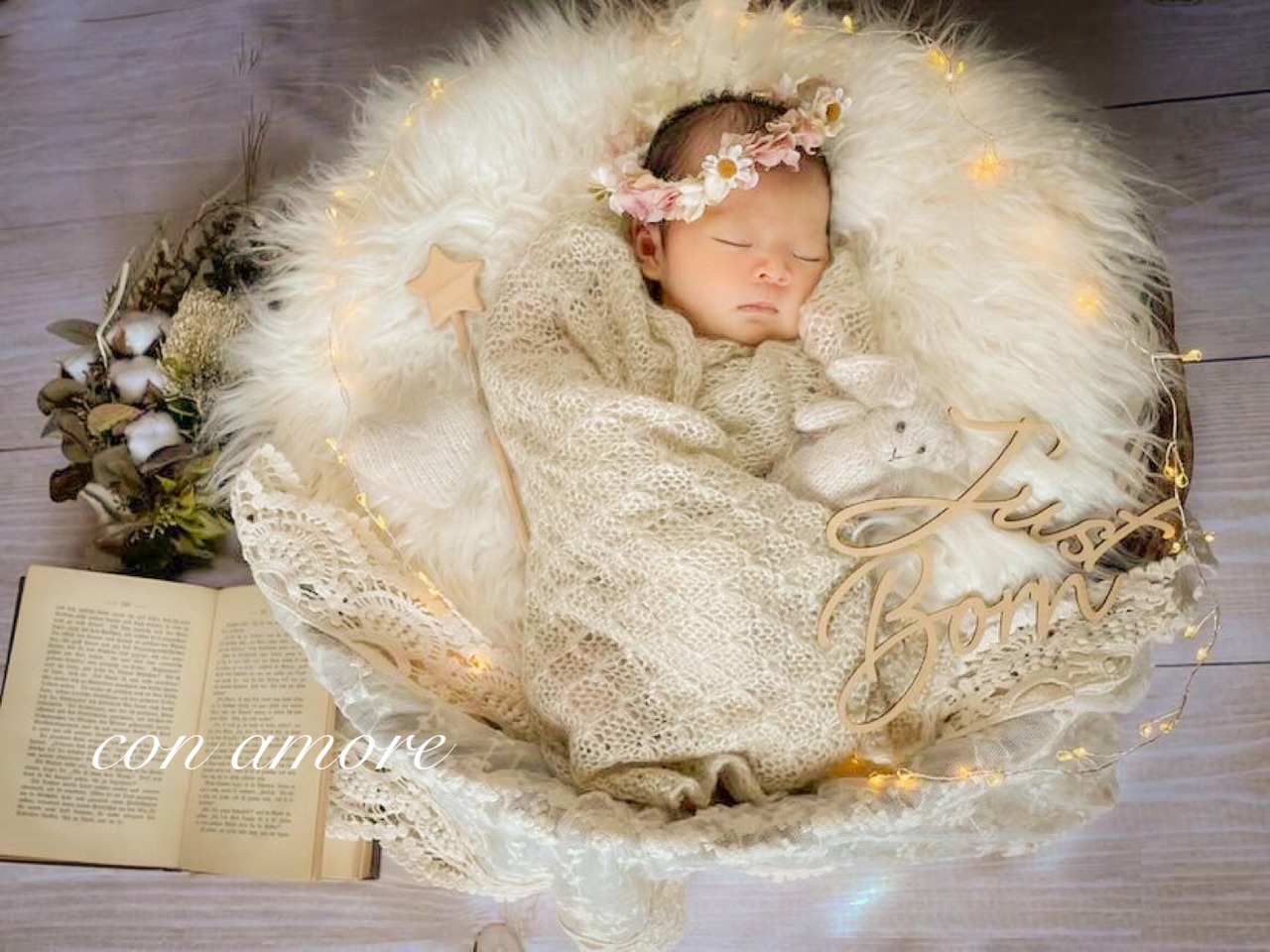 ファーマット・造花・洋書(年季が入っているものになります)・レターバナー・イルミネーション・あみぐるみ・星のステッキ・レース・レフ板・お衣装4点(①うさぎさん、②くまさん、③ドレスと花冠または小人服、④おくるみ)・マニュアル(撮り方コツや返送の仕方を記載)