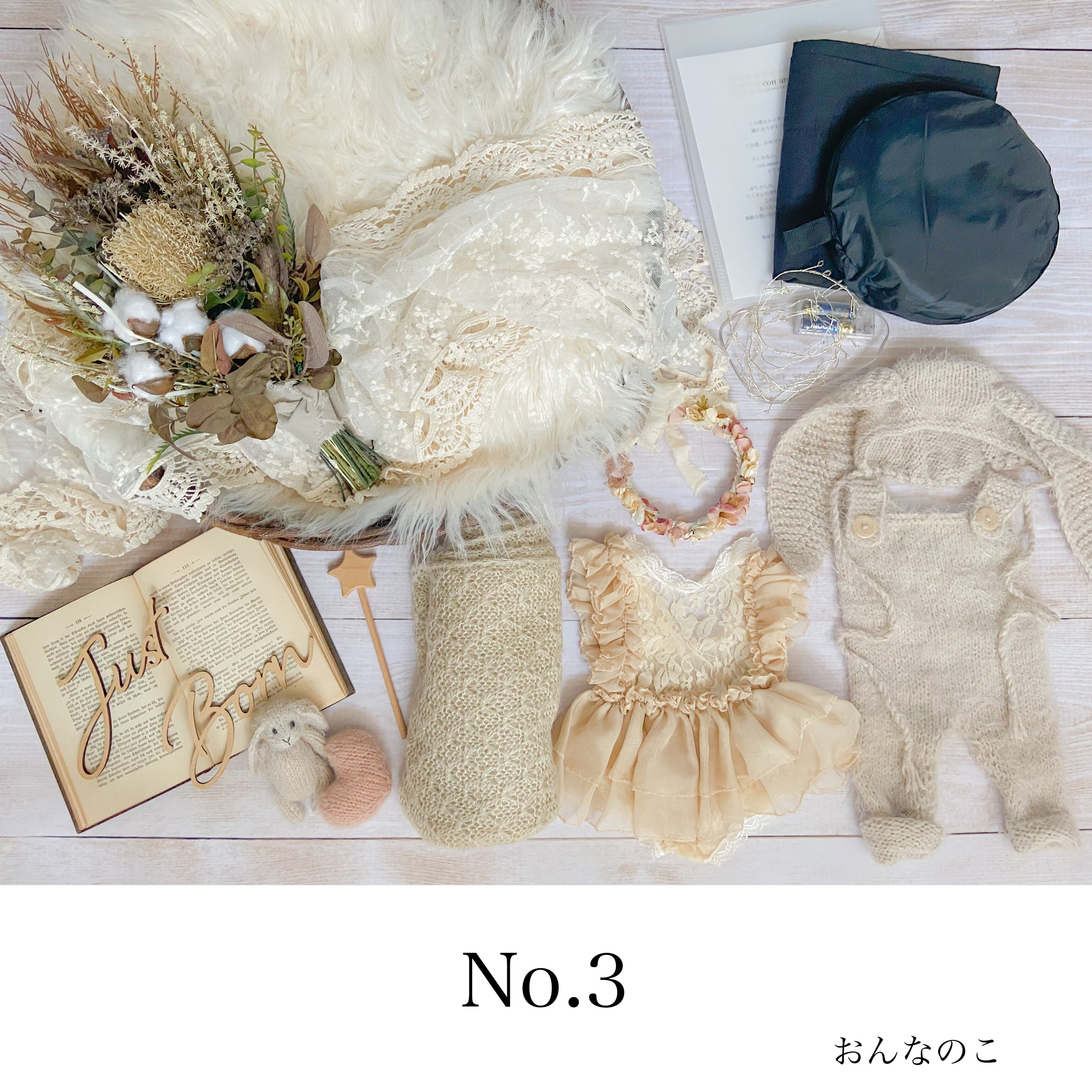 ファーマット・造花・洋書(年季が入っているものになります)・レターバナー・イルミネーション・あみぐるみ・星のステッキ・レース・レフ板・お衣装4点(①うさぎさん、②くまさん、③ドレスと花冠または小人服、④おくるみ)・マニュアル(撮り方コツや返送の仕方を記載)