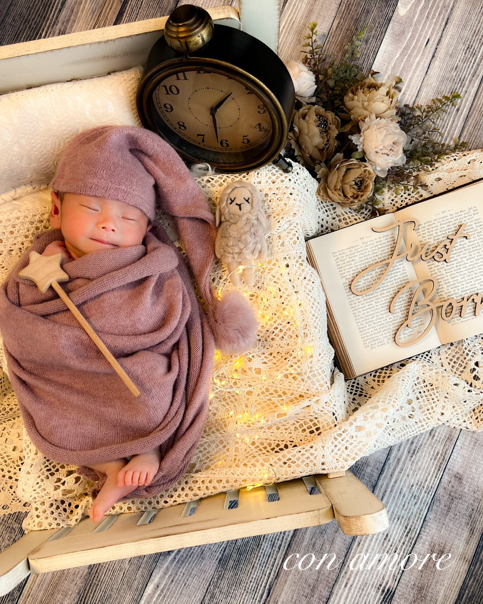 枕・造花・洋書(年季が入っているものになります)・レターバナー・イルミネーション・置き時計・あみぐるみ・星のステッキ・大判レース・レフ板・お衣装4着(①うさぎさん、②くまさん、③ドレスと花冠または探偵とメガネ、④おやすみ衣装くすみピンクまたはベージュ)・マニュアル(撮り方コツや返送の仕方を記載)
