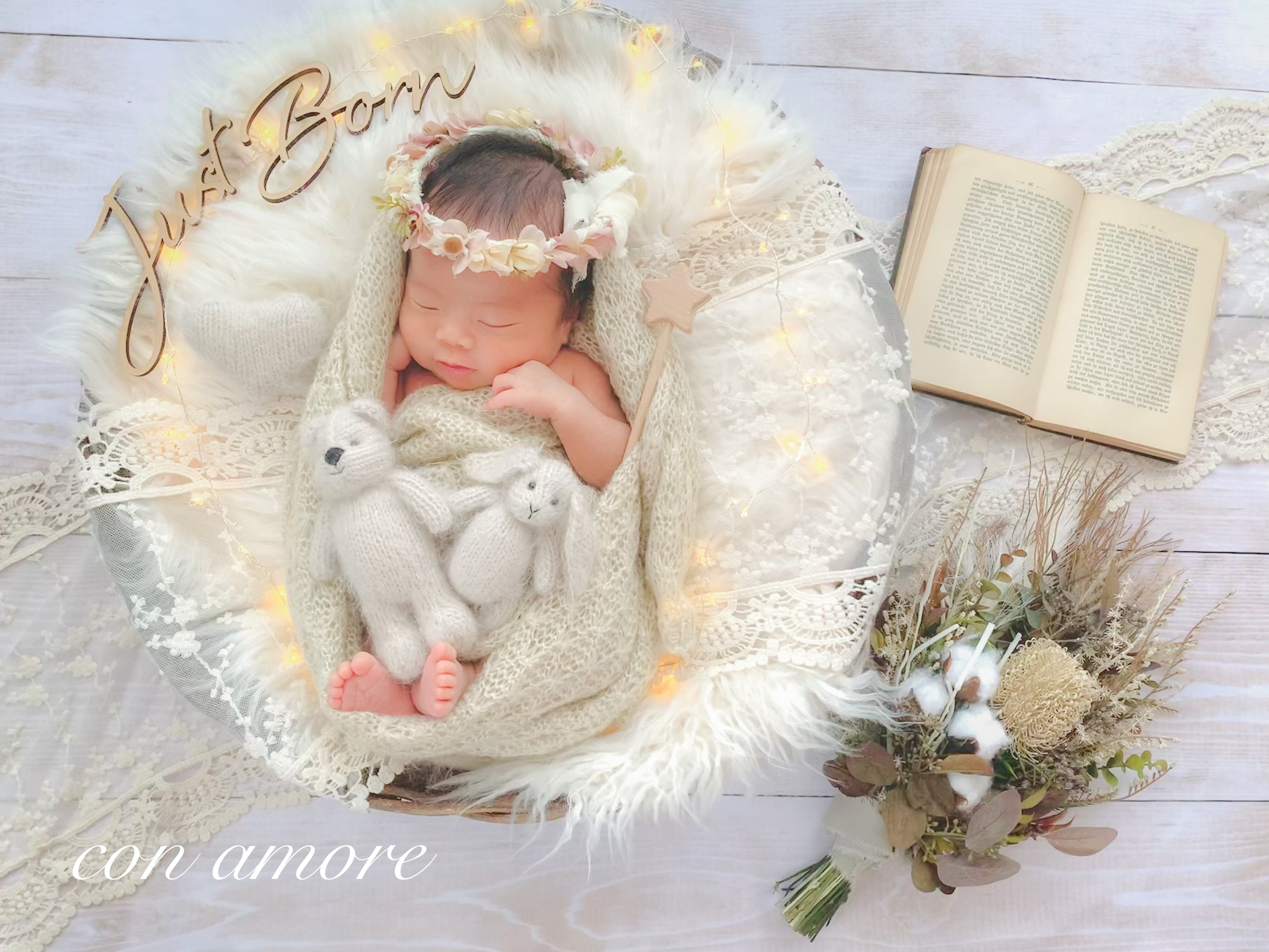 ファーマット・造花・洋書(年季が入っているものになります)・レターバナー・イルミネーション・あみぐるみ・星のステッキ・レース・レフ板・お衣装4点(①うさぎさん、②くまさん、③ドレスと花冠または小人服、④おくるみ)・マニュアル(撮り方コツや返送の仕方を記載)
