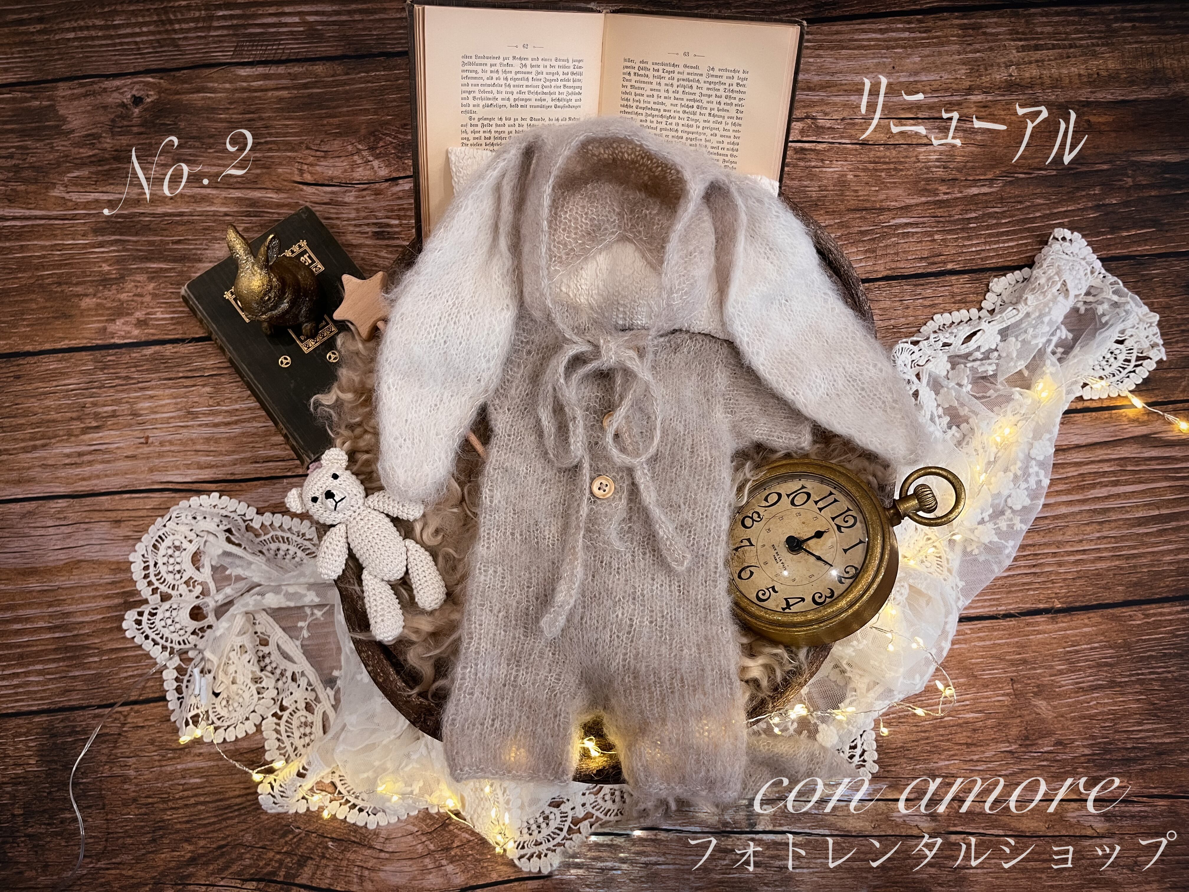 お衣装4点(①うさぎさん、②くまさん、③ドレスと花冠または探偵とメガネ、④小人服くすみピンクかベージュ)・マニュアル(撮り方コツや返送の仕方を記載)