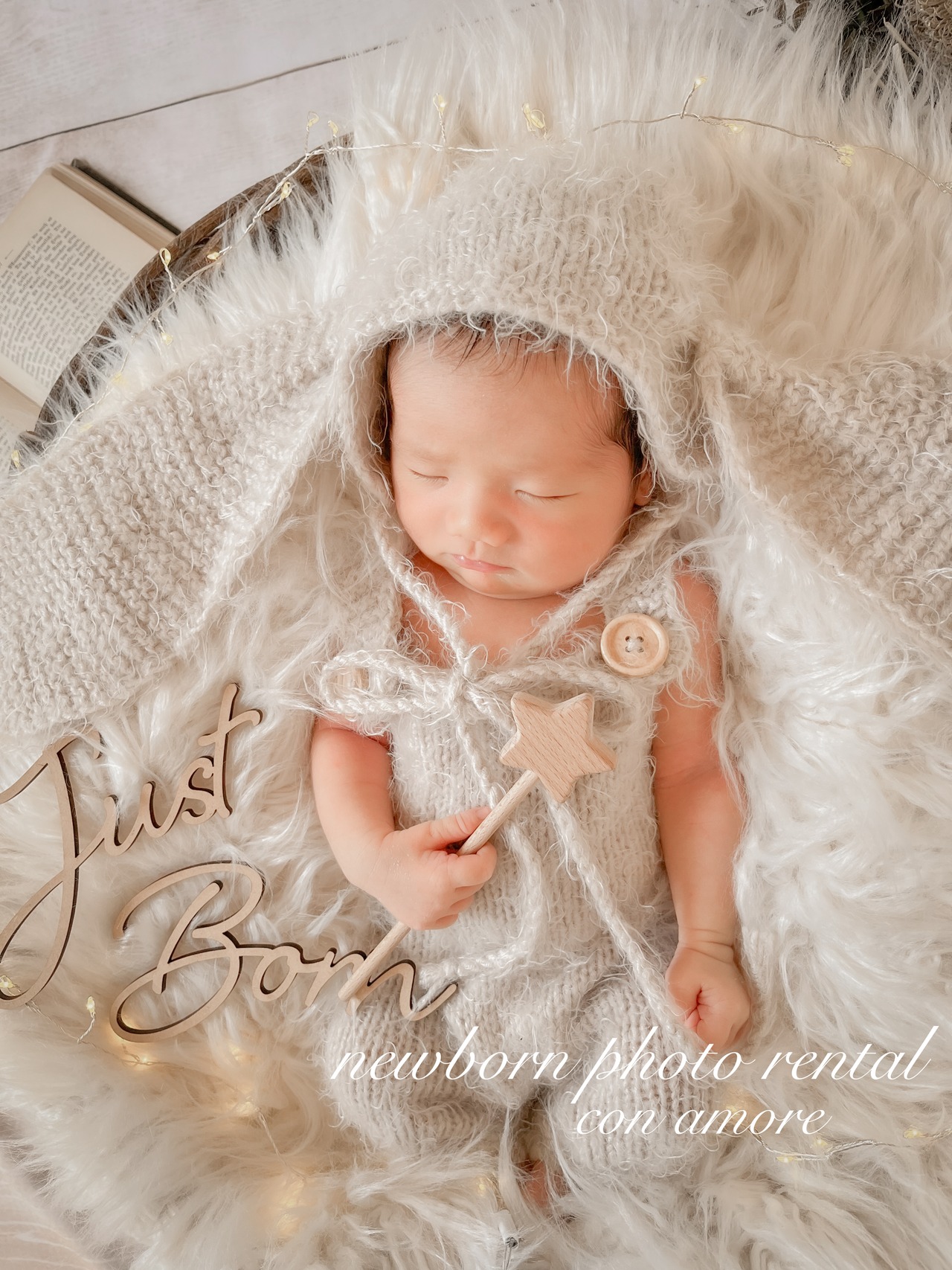 ファーマット・造花・洋書(年季が入っているものになります)・レターバナー・イルミネーション・あみぐるみ・星のステッキ・レース・レフ板・お衣装4点(①うさぎさん、②くまさん、③ドレスと花冠または小人服、④おくるみ)・マニュアル(撮り方コツや返送の仕方を記載)